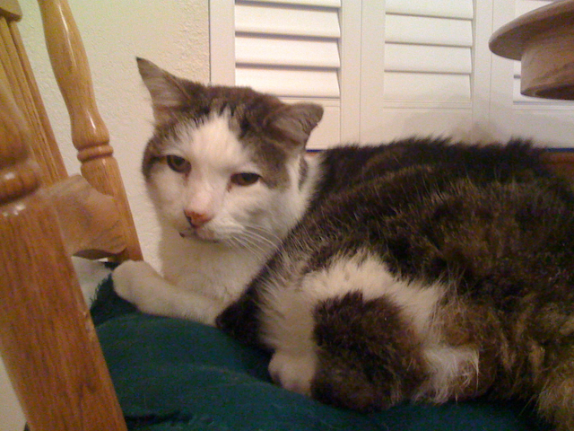 My wife didn’t remember when she got this cat. Lucky was the original name, but eventually it is shortened to be just Ki. Ki came to the house sometimes after we started dating, but it was still early in the relationship, so I didn’t know much about Ki until later, when the relationship moved to the point where I spent the night there. One of my earlier impression of Ki is that she always liked to stay on top of the fridge. It turned out that my wife had a small bowl with some water plants and some fish, and Ki loved to just lay there and watch and sometimes put one paw in to poke the fish. The fish died, eventually, perhaps due to the stress of a giant cat watching and poking nearby. After the fishes are gone, Ki didn’t go up to the fridge much anymore.