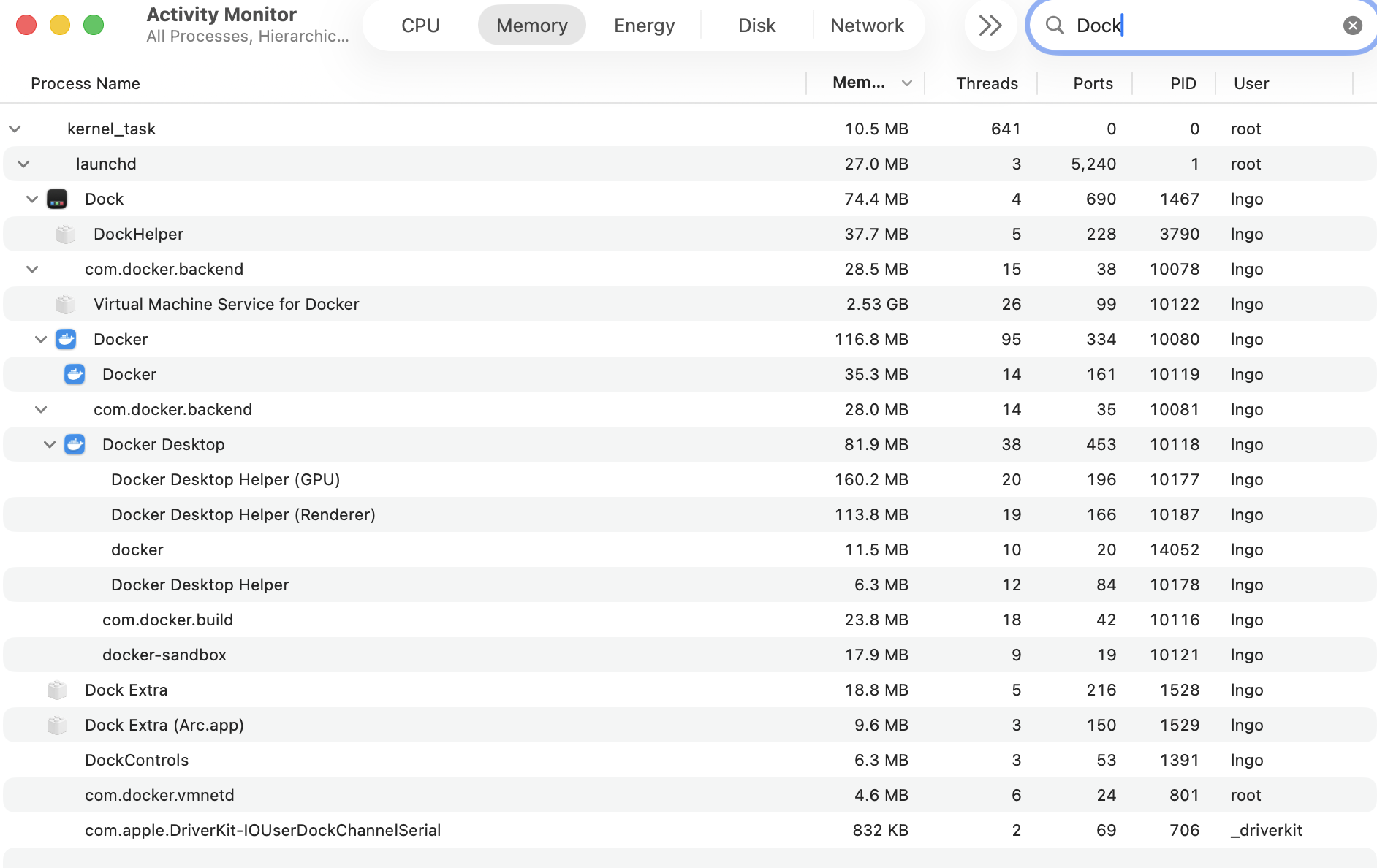 We can type the name of an application into the search box on the top right corner of Activity Monitor to filter down to only processes related to the entered keyword, which would be the name of the Application. At this point, we can ballpark the memory usage of these applications. For example, Docker is costing me around 2.6G of memory, with one container running.