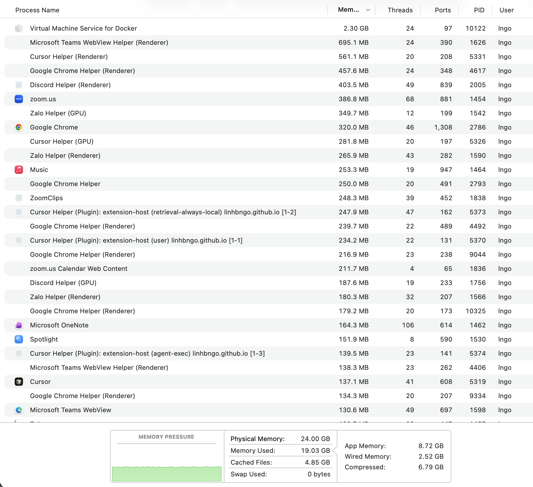 Last week, I was teaching my Introduction to Cloud Computing class, and I was demonstrating to my students how additional containers can place additional constraints on the host computer’s resources using my MacBook Pro M4 24GB. As I was showing Mac’s Activity Monitor, one thing that struck me was that I was using 18 out of 24GB of available memory. This surprised me by a lot. I thought at most I was consuming 10-12GB, and it turned out that I was wrong. So what have I been using that consumed this much memory?
