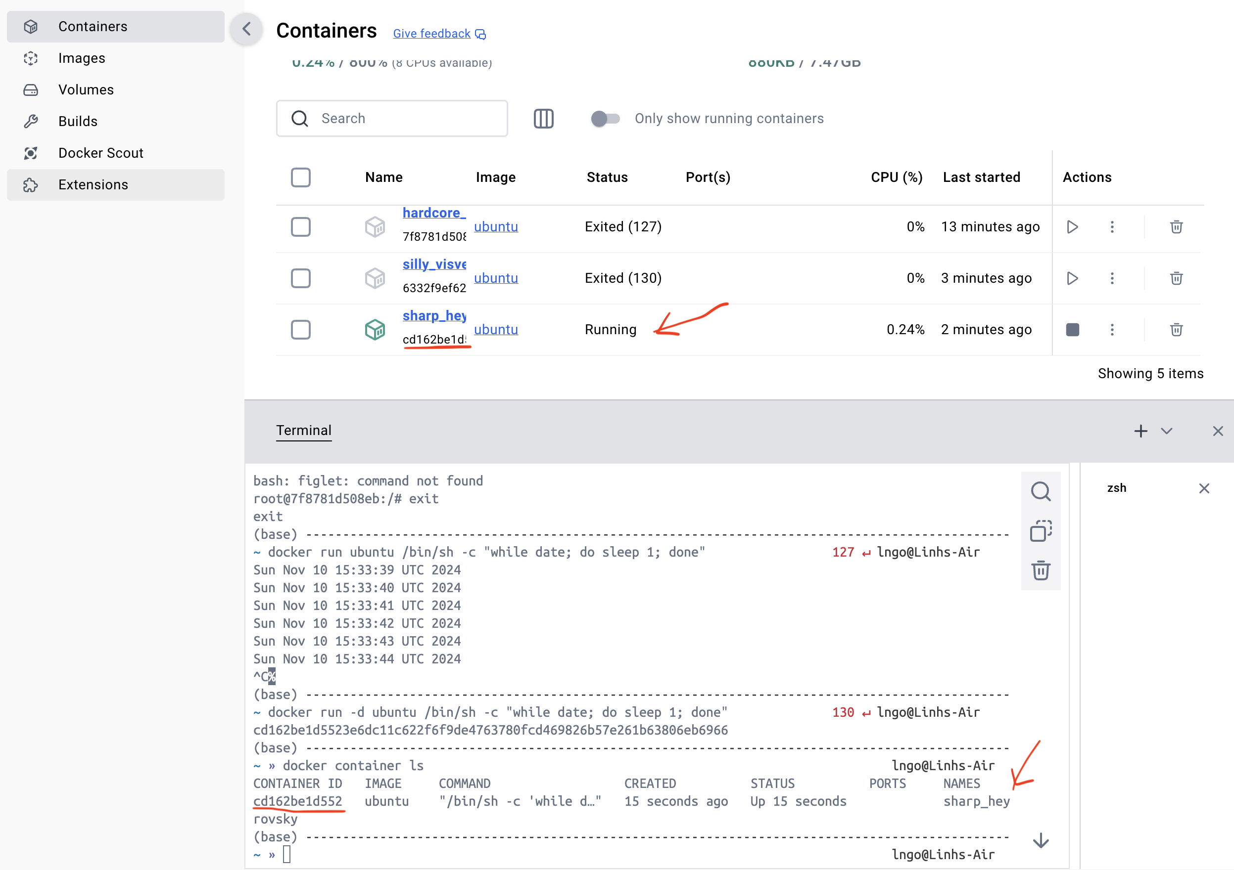 docker container ls command and in the GUI’s container tab.