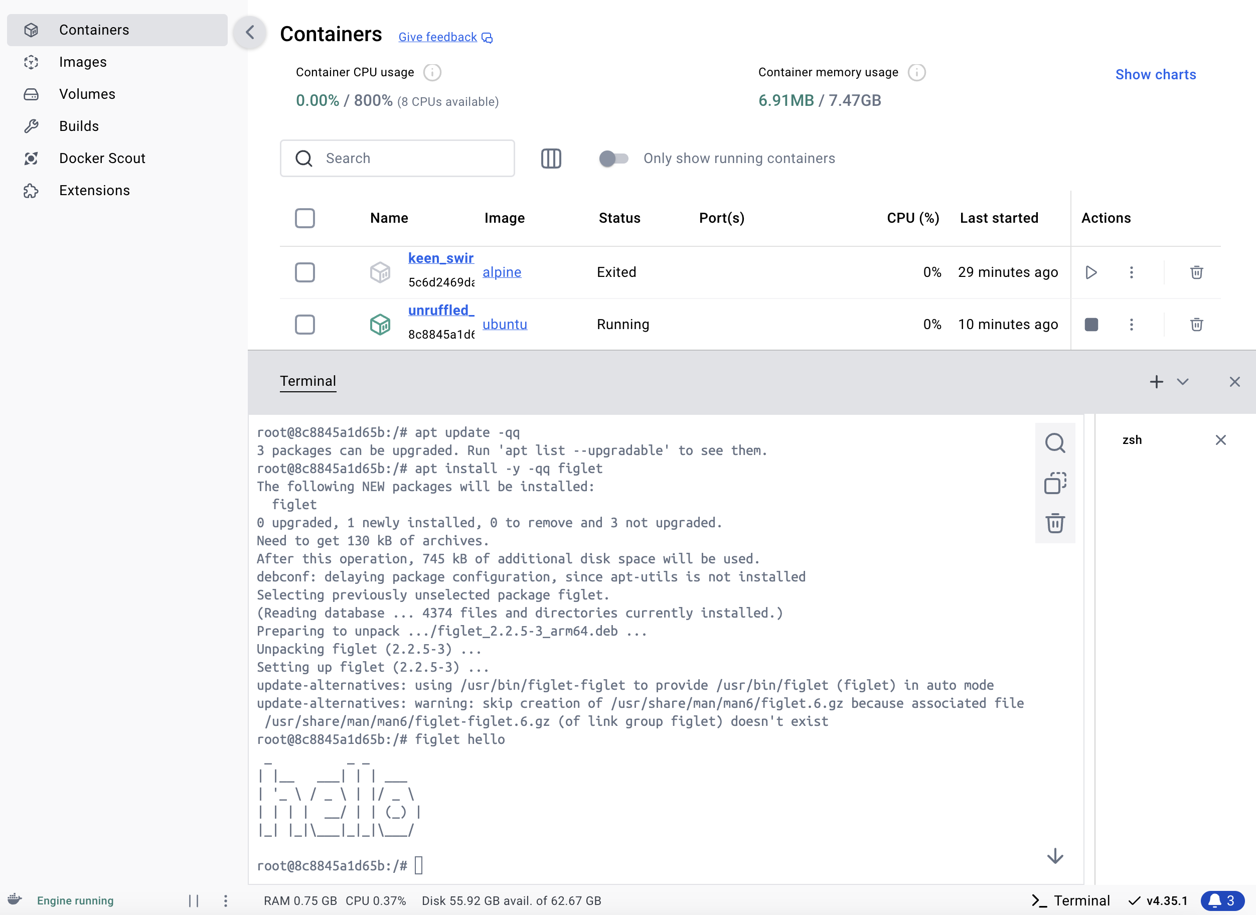 figlet, test, then exit the container