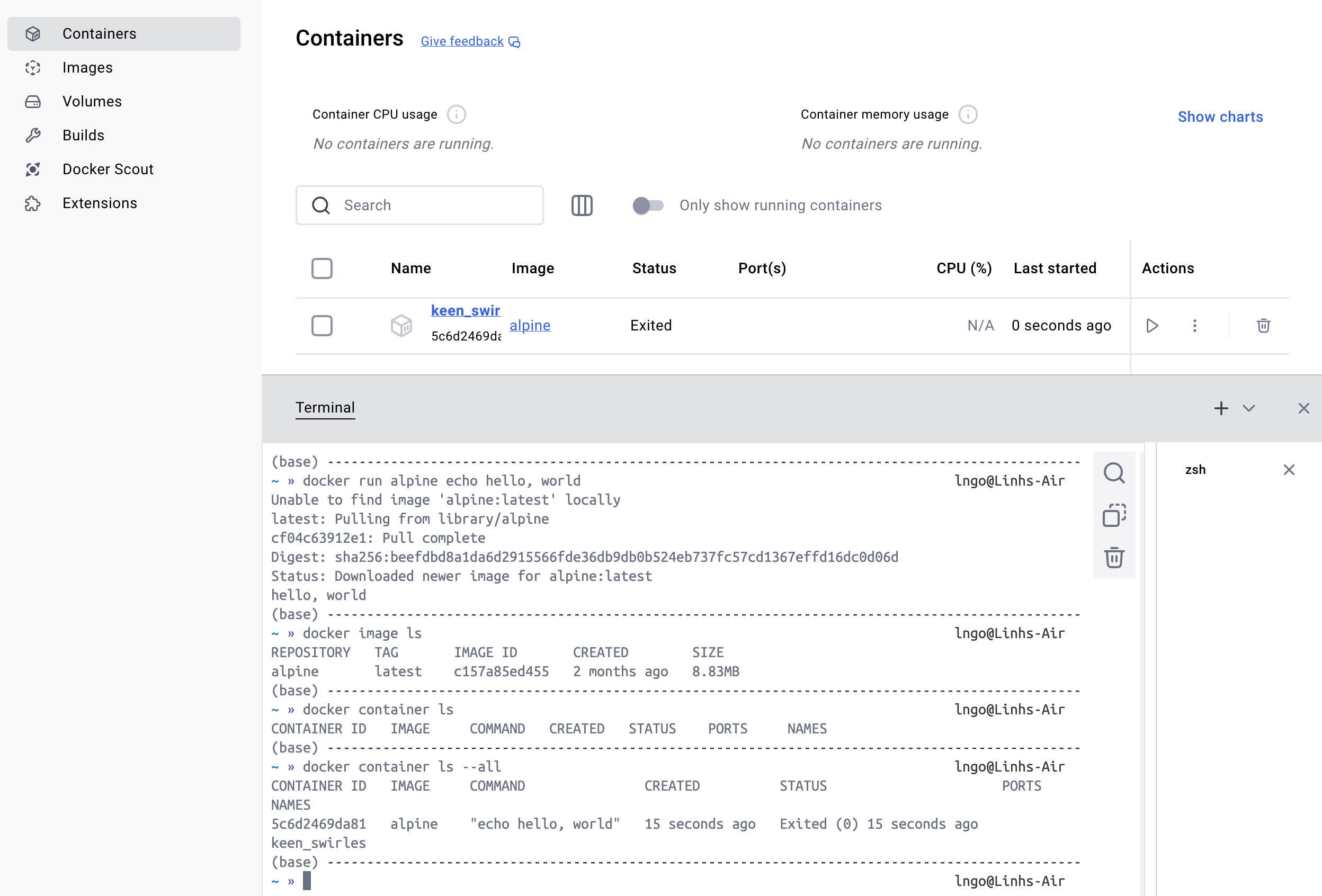 docker run alpine echo hello world docker: invoke the container engine.run: subcommand to run a container.alpine: name of the image based on which a container will be launched.echo hello, world: the command to be executed in the container environment.docker image ls docker container ls docker container ls --all