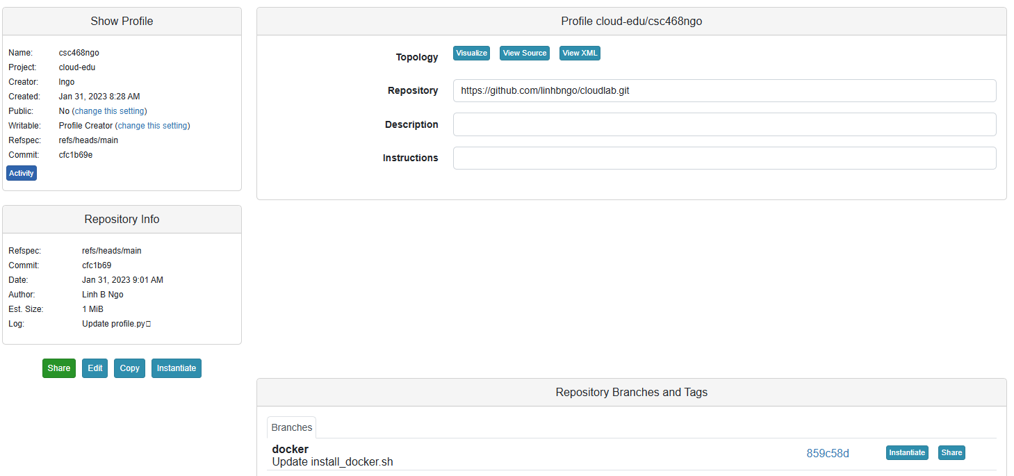 port-on-host:port-on-container -p flag.127.0.0.1:30080 to confirm that the Node server inside the container is still reachable.docker from the main branch.docker branch contains all files from Dr. Ngo’s cloudlab repository’s docker branch.Edit and Update the link to the GitHub repository.docker added to the Repository Branches and Tags of your CloudLab profile.Instantiate button for this branch.