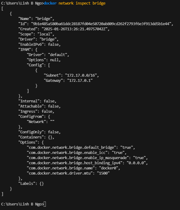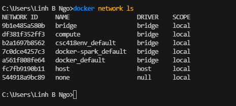 bridge compute, csc418env_default, docker-spark_default, and docker_default: Dr. Ngo’s custom networksdocker network inspect NAME: inspect the NAME network
