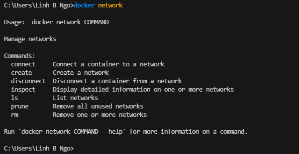 bridge: The default network driver.host: Remove network isolation between the container and the Docker host.none: Completely isolate a container from the host and other containers.overlay: Overlay networks connect multiple Docker daemons together.ipvlan: IPvlan networks provide full control over both IPv4 and IPv6 addressing.macvlan: Assign a MAC address to a container.docker network will list all possible command options