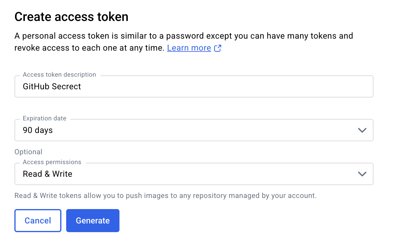 Generate new token Access token description: GitHub SecretExpiration date: 90 daysAccess permissions: Read & WriteGenerate