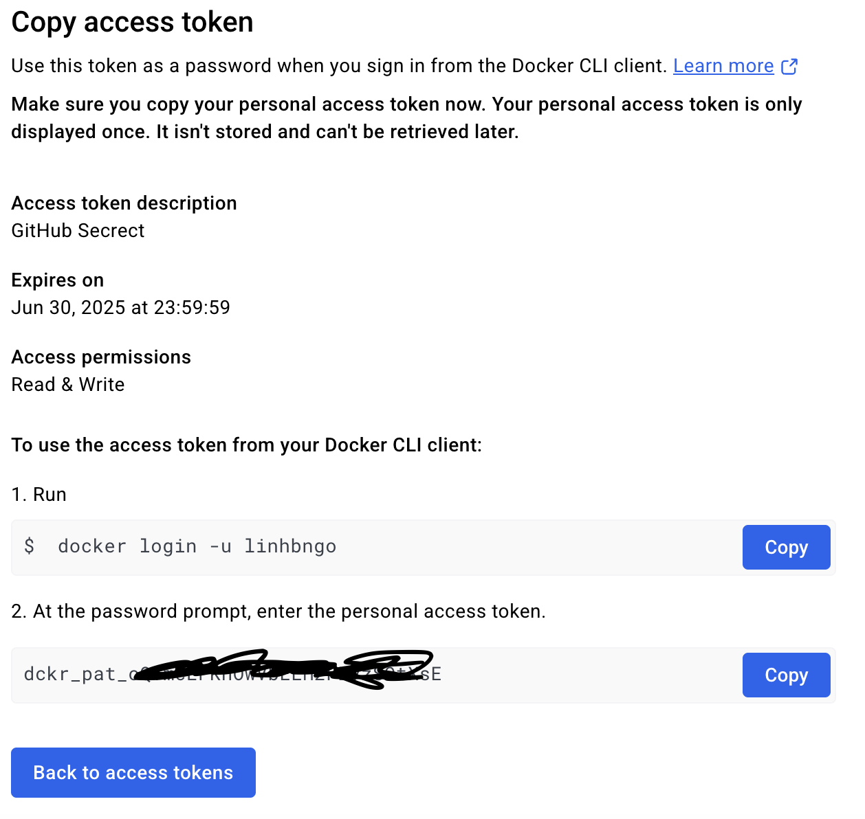 DOCKERHUB_TOKEN: your DockerHub login nameDOCKERHUB_USERNAME: The secret token generated by Docker Hub earlier.