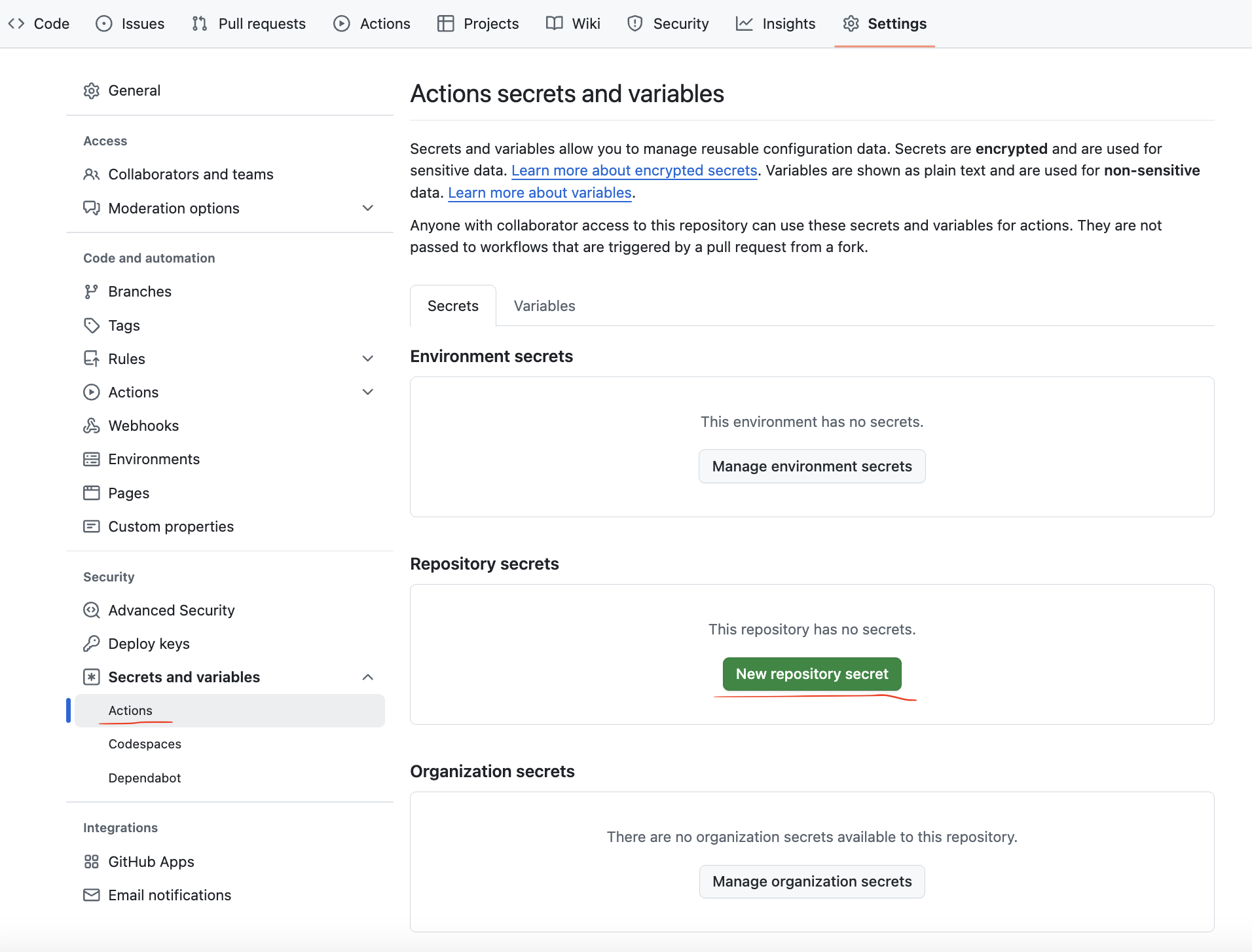 Settings/Secrets and variables/Actions/new repository secret