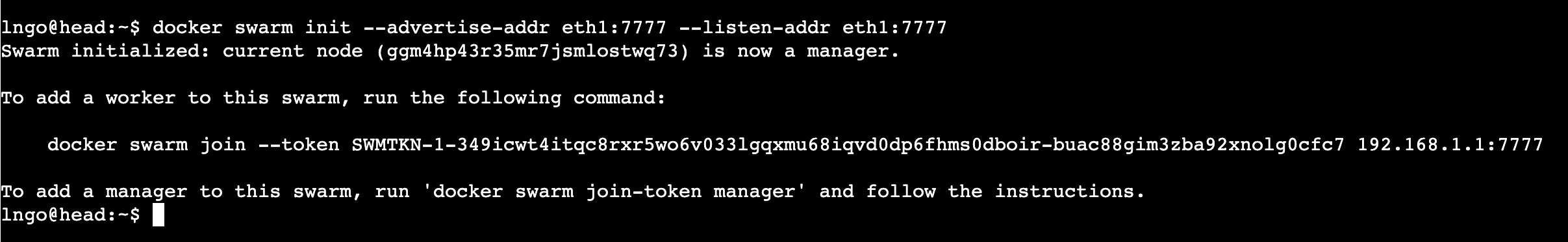 docker swarm init --advertise-addr eth1:7777 --listen-addr eth1:7777
