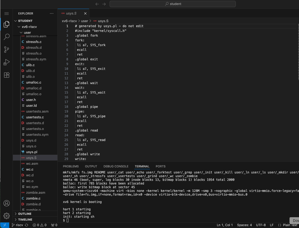 localhost:18088 or 127.0.0.1:18088)user/usys.pl during build.ecall) for each syscall.