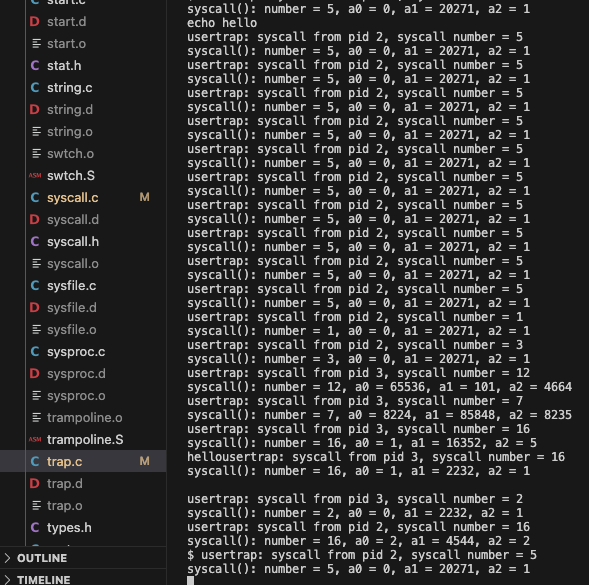 printf("usertrap: syscall from pid %d, syscall number = %ld\n", p->pid, p->trapframe->a7);