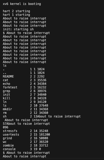 devintr() that clockintr() happens and the return value.usertrap() that the yield() function is invoked.yield()?swtch.S, which contains the implementation of swtch() call inside sched().clockintr() inside kernel/trap.c w_stimecmp call to increase frequency between interrupt request so that it becomes more observable.