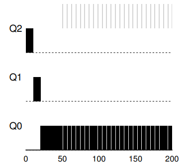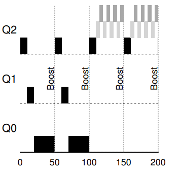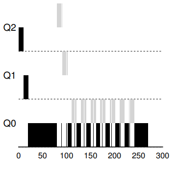 System maintains three queues, in the order of priority from high to low: Q2, Q1, and Q0.