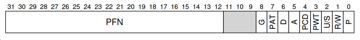 PFN: 20 bits for physical page frame number (page size 4K)P: present bit, whether this page is on memory or on disk (swapped)R/W: read/write bit, whether writes are allowed to this pageU/S: user/supervisor bit, whether user-mode processes can access this pageA: access bit, whether this page has been accessedD: dirty bit, whether this page has been modifiedPWT, PCD, PAT, G: how hardware caching works for this page