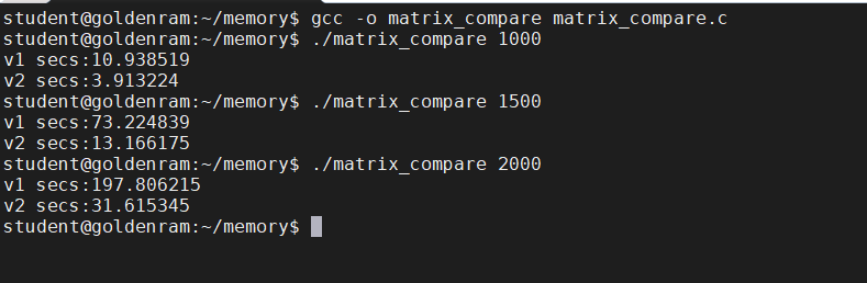 matrix_compare.c with the following contents:matrix_mul_v1 or matrix_mul_v2) represents which multiplication approach from the question?matrix_compare.c: