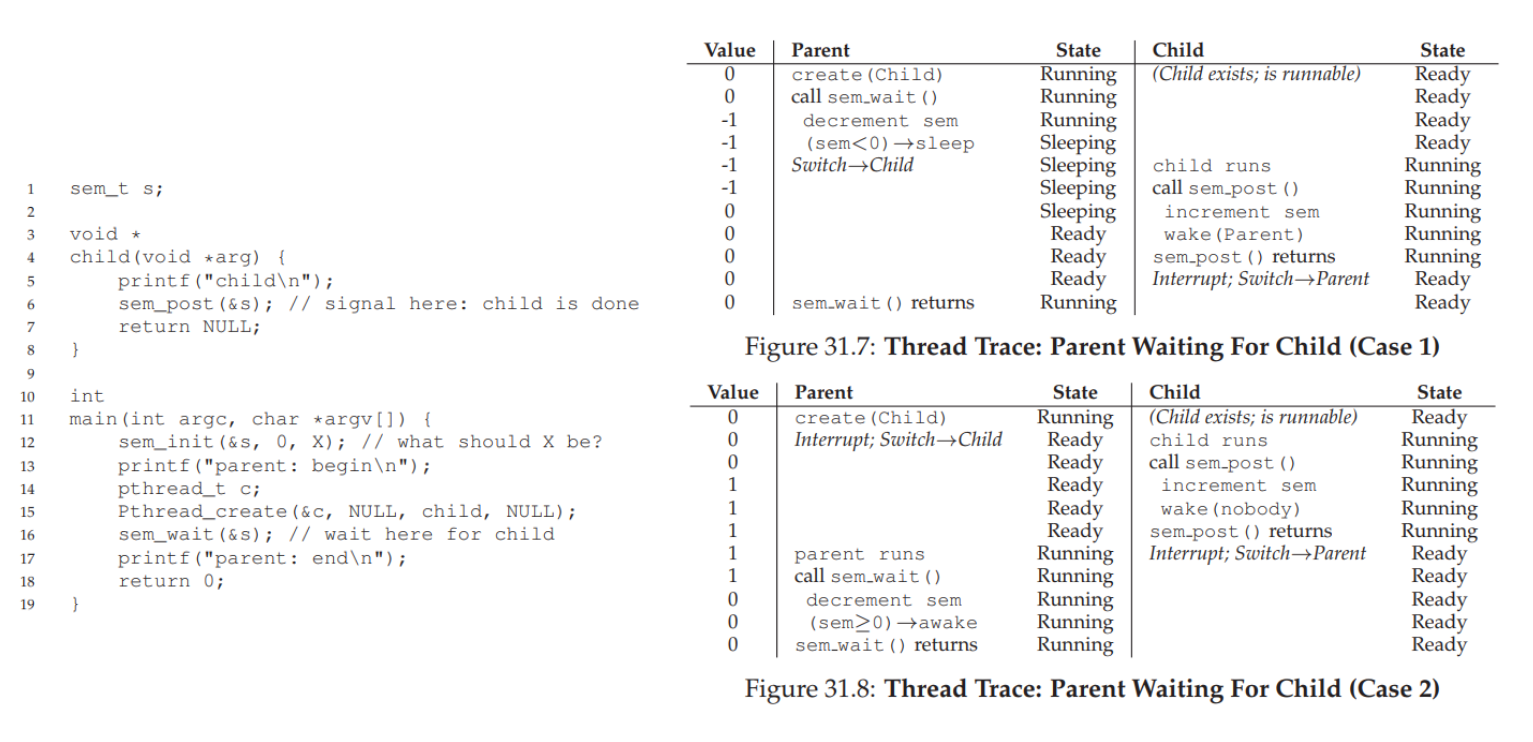 sem_init(&s, 0, X); // initialize semaphore to X. What should X be?