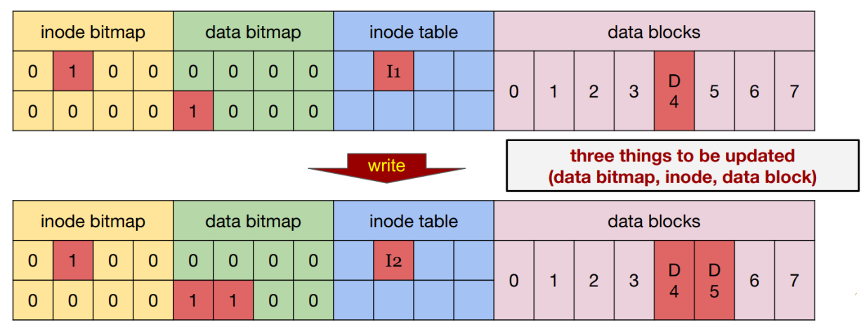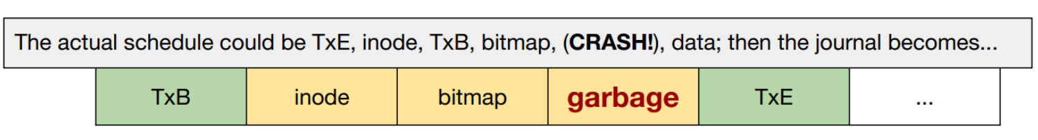 inode has data block pointer pointing to an unwritten data blockinode, we will read garbage datadata bitmap and the inode: inode says that the data block #5 is used, but data bitmap say it is not.block #5 again and overwrite its data by mistake
