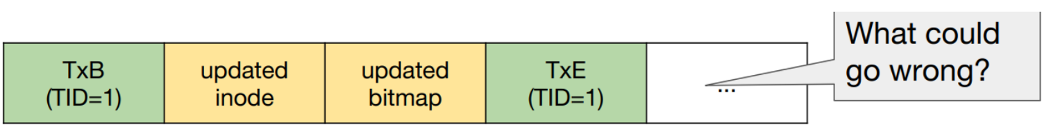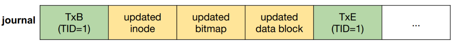 transaction begin (TxB) block, containing a transaction id (TID) followed by blocks with the exact content to be written. transaction end (TxE) block, containing the TID.