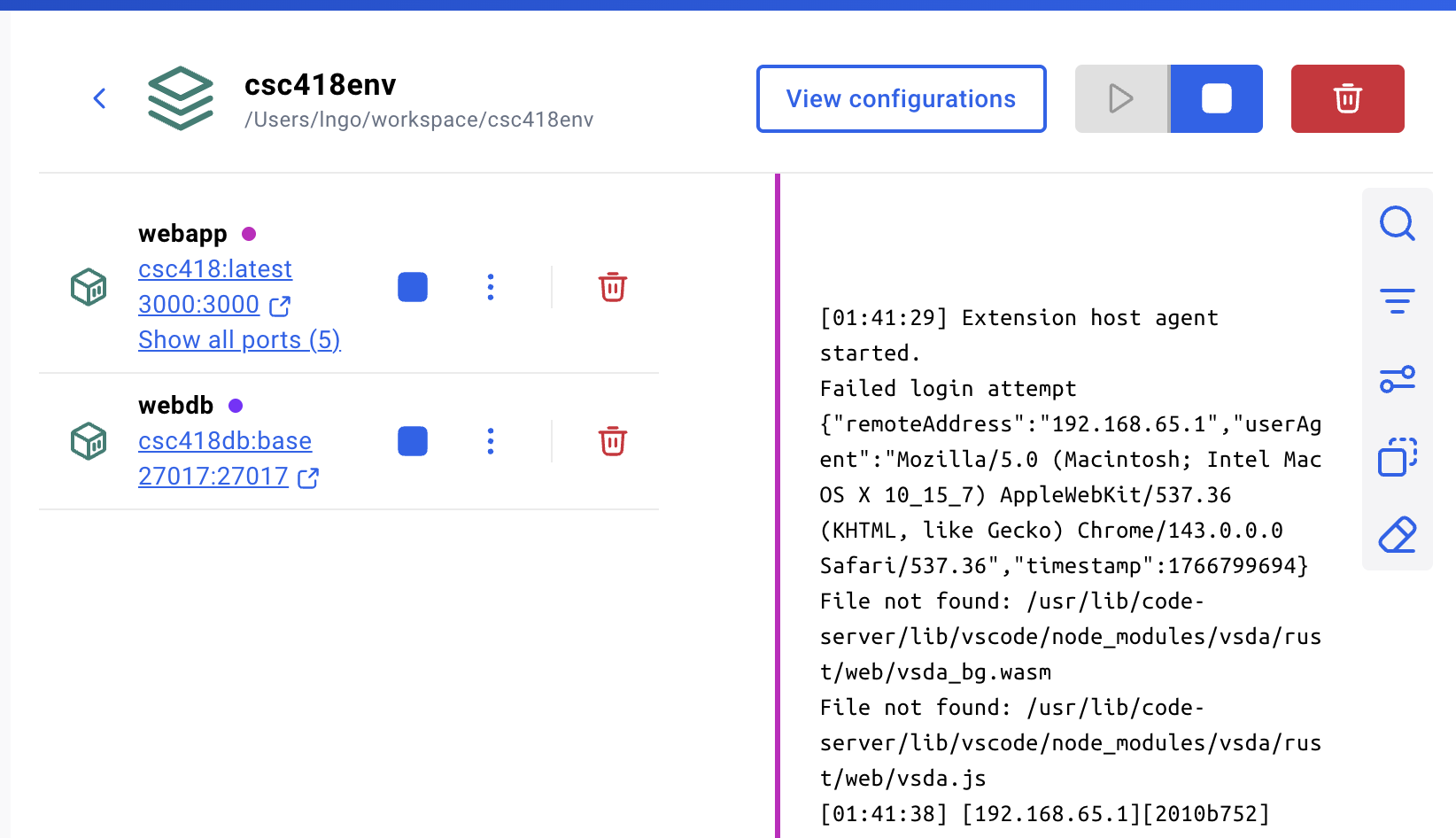 For this class, with the container structure, we are assuming a remote MongoDB server located on node webdb. You will need to change the dbURL value accordingly: