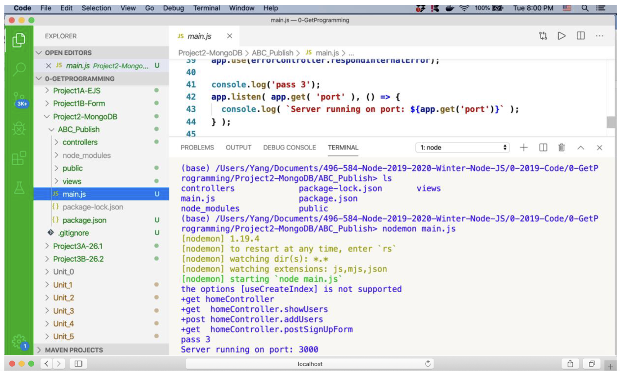 You need to show the screenshot of the IDE with the main routing statements shown in the editing area, and the process of adding a user is displayed in the Terminal area. Of course, we cannot tell if this was indeed retrieved from a database without checking the code in the homecontroller.js. So please show the screenshot of part of the homecontroller.js and the code. You may use any IDE to show the code.