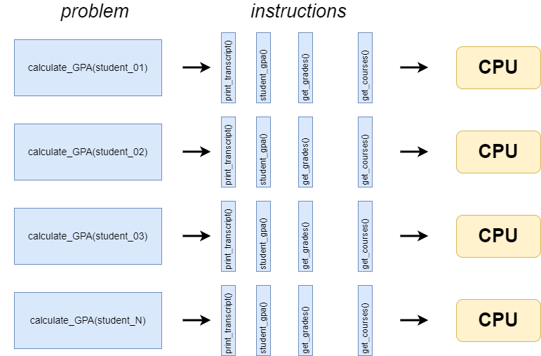 Introduction to paralel and distributed computing A simple computation problem Final GPA calculation Components of a computation problem Computational task Execution framework. Computing resources. Computational tasks should be able to … Be broken apart into discrete pieces of work that can be solved simultaneously. Be solved in less time with multiple computing resources than with a single computing resource. Execution framework should be able to … Execute multiple program instructions concurrently at any moment in time Computing resources might be … A single computer with multiple processors. An arbitrary number of computers connected by a network. A special computational component inside a single computer, separate from the main processors (GPU), or Any combinations of the above. Parallelizing final GPA calculations Parallel and distributed computing systems Definition A collection of individual computing devices that can communicate with each other. (Attiya and Welch, 2004)