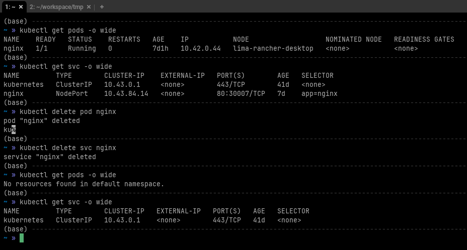 kubectl and Pods-only YAML files is a manual process. Deployment (or StatefulSets, DaemonSets) to manage PodsService to maintain stable networking access.nginx pod and one nginx service running. Use the following commmands to check the existence of the pod and service, then to delete the pod and service. After deletion, check again to confirm that the pod and service are gone.