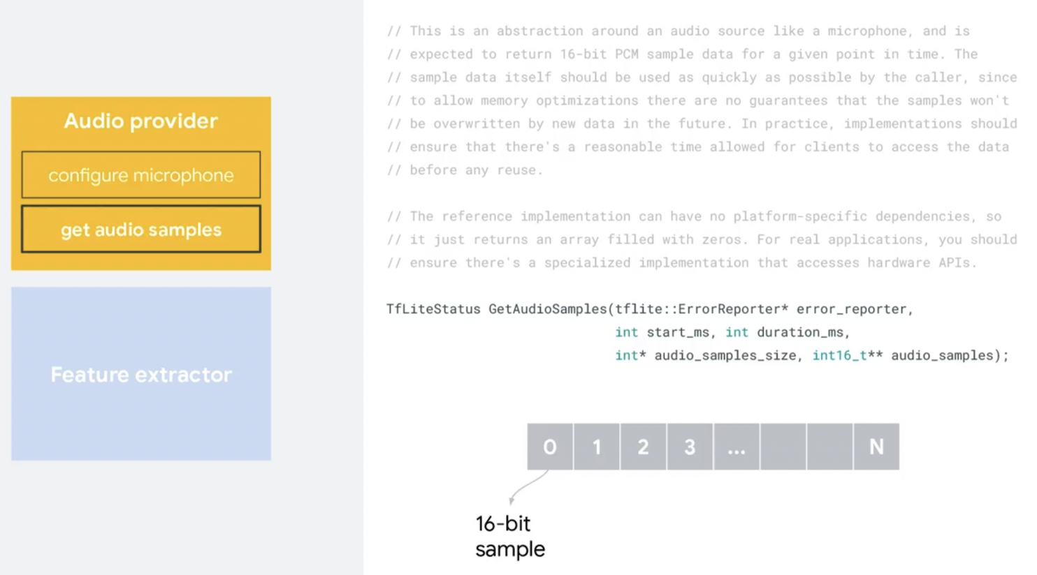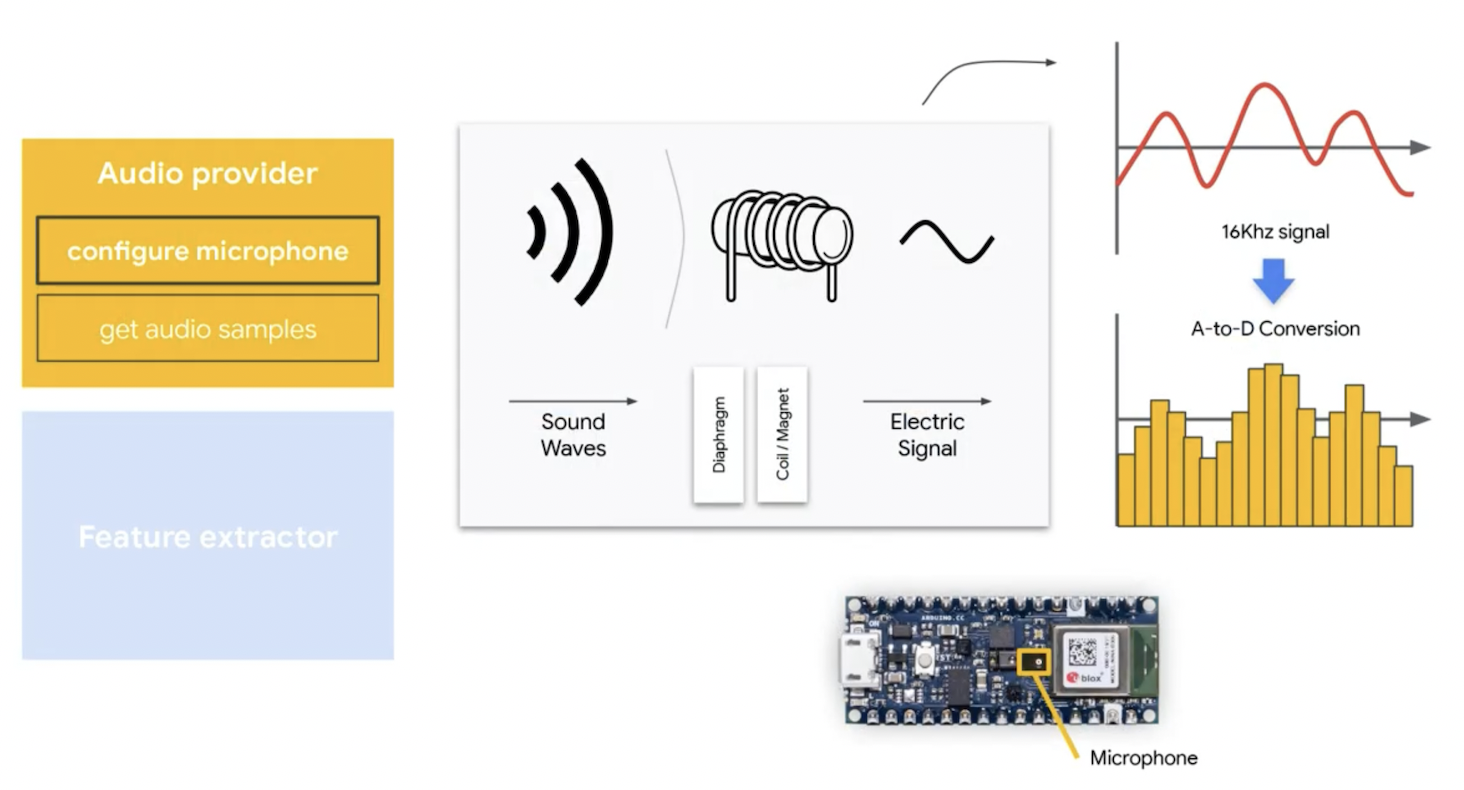 spectrogram that is consumed by neural network.void loop()/PopulateFeatureData: right click then go to definition GetAudioSamples InitAudioRecording/CaptureSamples
